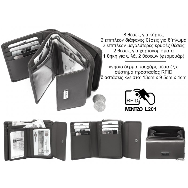 Όλα τα πορτοφόλια MENTZO είναι εφοδιασμένα με το ειδικό σύστημα προστασίας RFID το οποίο δημιουργεί μια ηλεκτρονική ομπρέλα προστασίας για τις χρεωστικές και πιστωτικές κάρτες σας. Έτσι δεν χρειάζεται πλέον να ανησυχείτε για κακόβουλες επιθέσεις σε σημεία με συνωστισμό, στα οποία άγνωστοι , με ειδικά μηχανάκια ανέπαφων συναλλαγών μπορούν να ¨ξαφρίσουν¨ τις κάρτες σας.