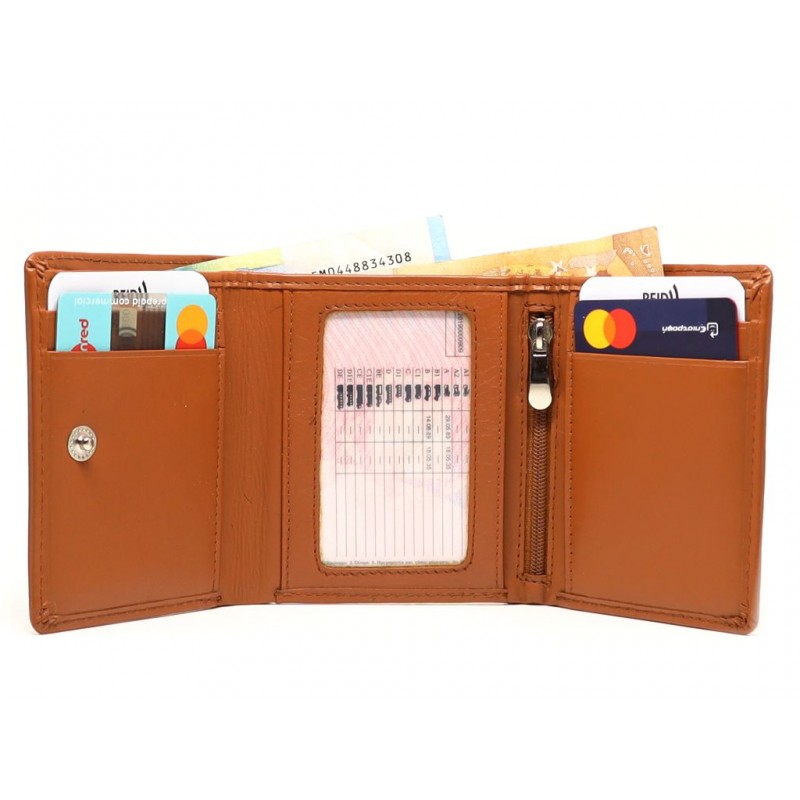 Το πορτοφόλι MENTZO L301 TAN IRIS RFID ανήκει στην κατηγορία των μικρών πορτοφολιών, κλείνει στα τρία με κουμπί, διαθέτει δύο θήκες για χαρτονομίσματα, δίπλωμα και κάρτες και απευθύνεται σε άντρες & γυναίκες. Είναι κατασκευασμένο από υψηλής ποιότητας δέρμα μοσχάρι. Ακόμη και μέσα δέρμα, που σημαίνει τεράστια αντοχή στο καθημερινό άνοιξε - κλείσε, σε αντίθεση με παρόμοια πορτοφόλια που διαθέτουν ακρυλικό PU στο εσωτερικό και σύντομα αλλοιώνονται. Τα κοψίματα και οι γραμμές του ξεχωρίζουν για την αρτιότητα που οδηγεί στο τέλειο αποτέλεσμα.